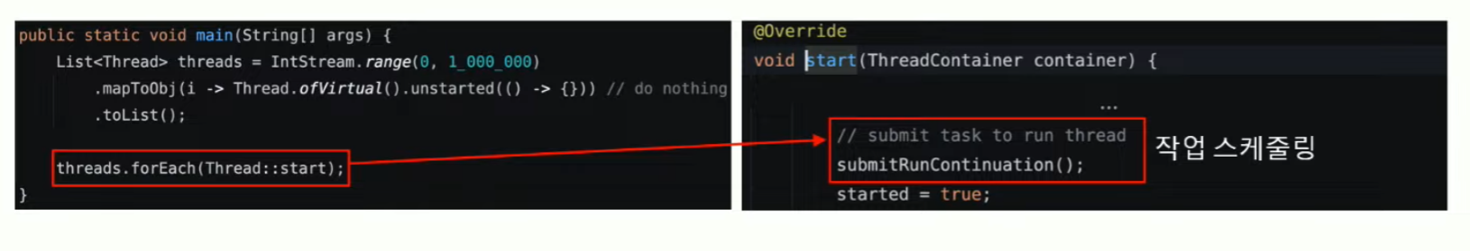 virtualThread::start → submitRunContinuation() //작업 스케줄링