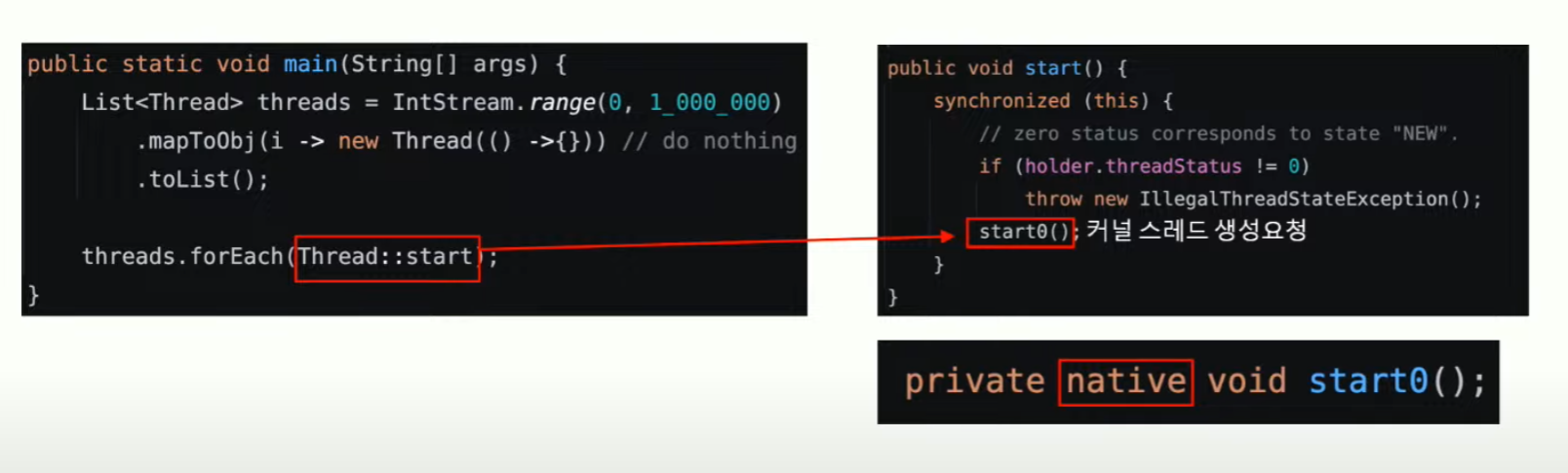 Thread::start → synchronized(){ start0() // 커널 스레드 생성요청} → native void start0