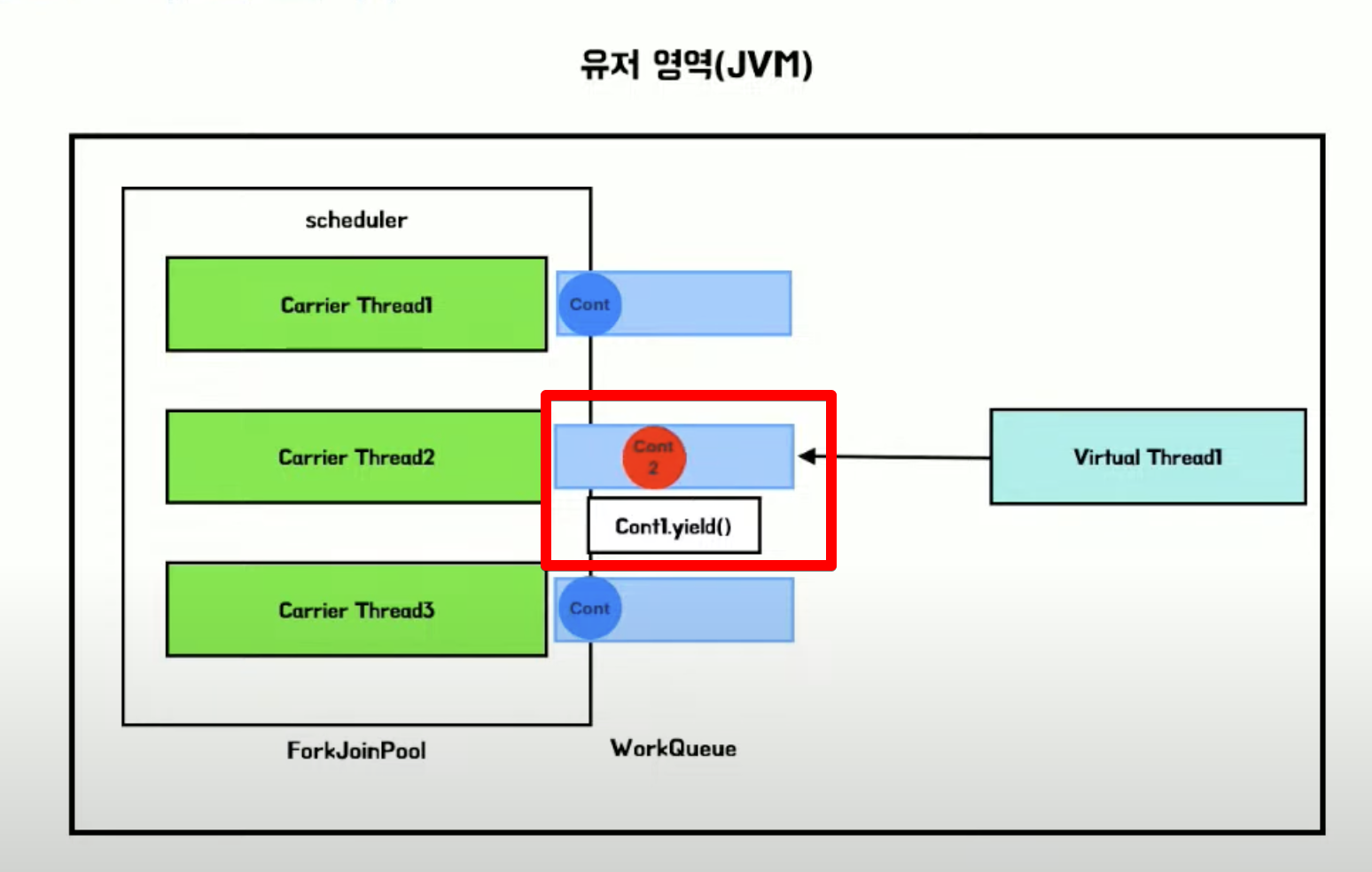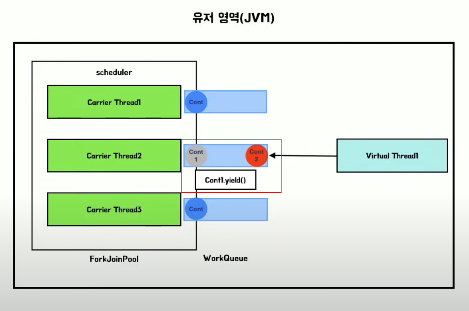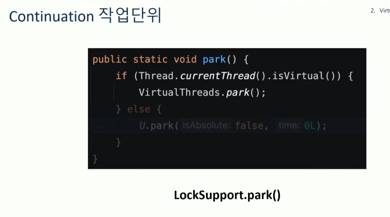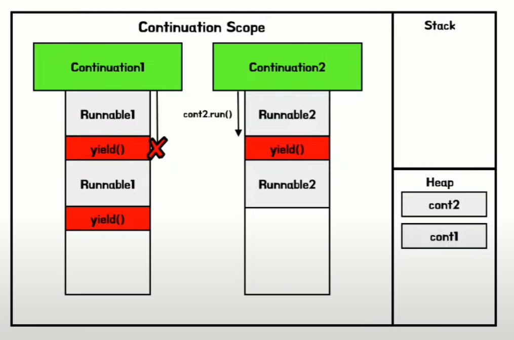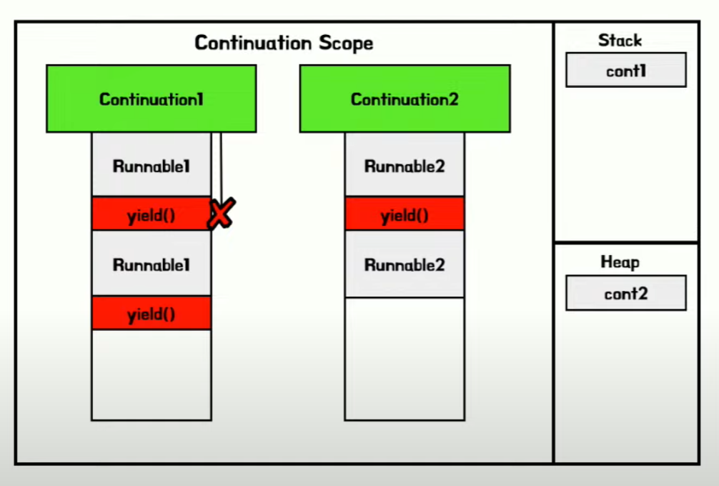 * Virtual Thread 는 작업 중단을 위해 continuatio yield
