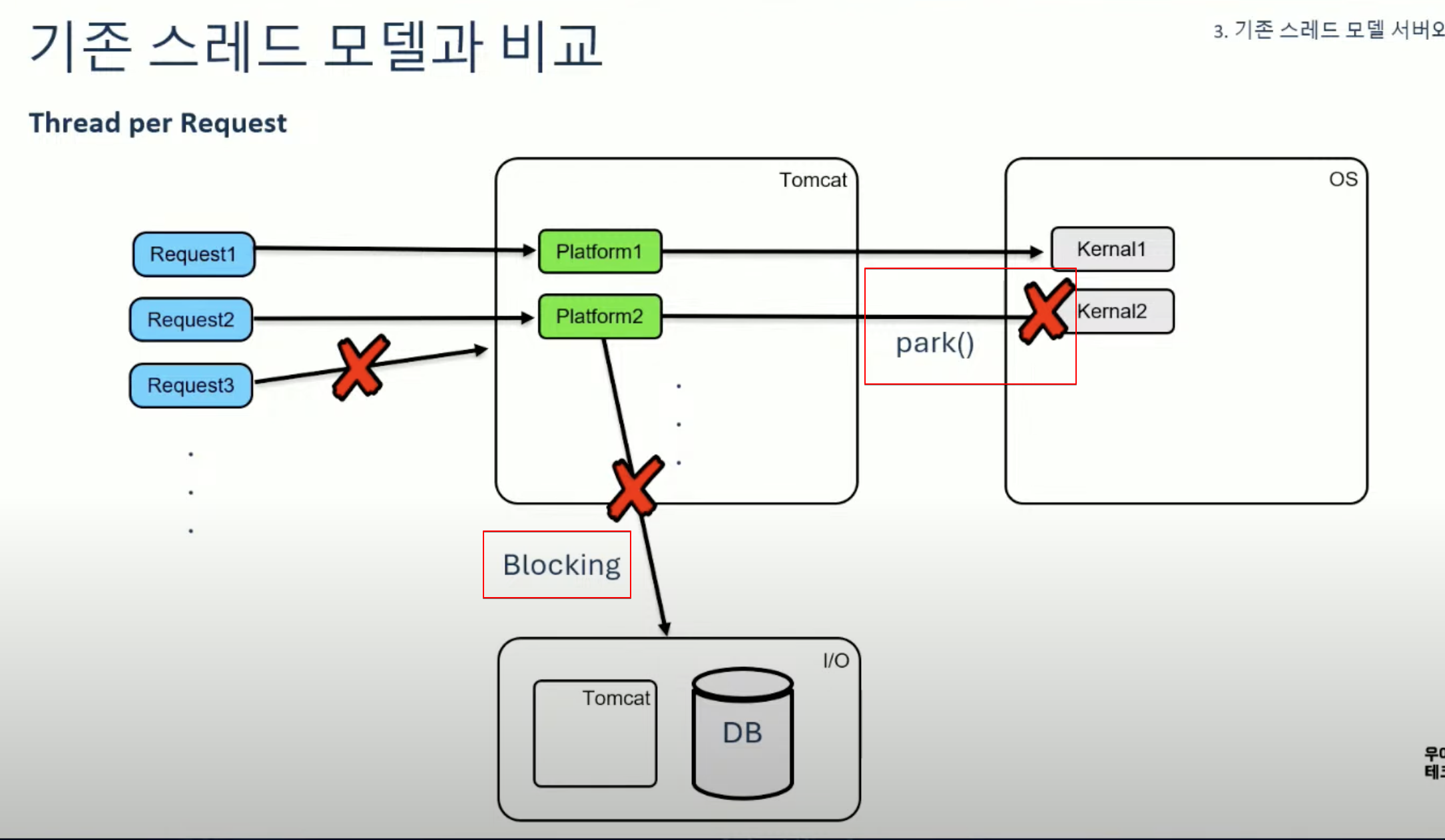 기존 스레드 모델에서는 Request2 를 처리하는 Platform2 스레드가 Blocking 되어 park() 를 호출하더라도, Request3 를 처리할 수 없습니다. Pool 에서 대기해야 함
