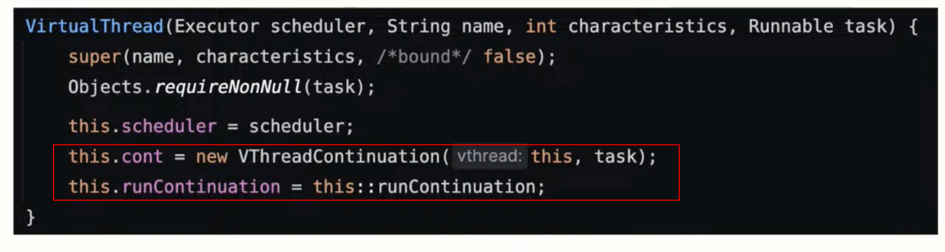 cont = new VThreadContinuation(this,task) // 받을 task 를 VThreadContinuation 으로 만들어서 가지고 있음