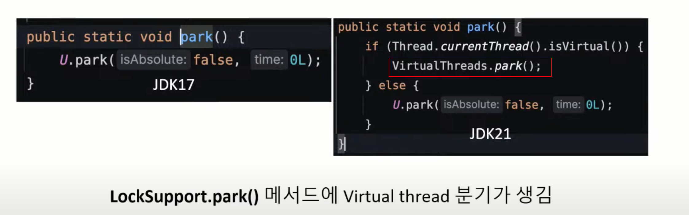 LockSupport.part() 는 아래처럼 isVirtual() 검사 후 park 호출하는 메소드