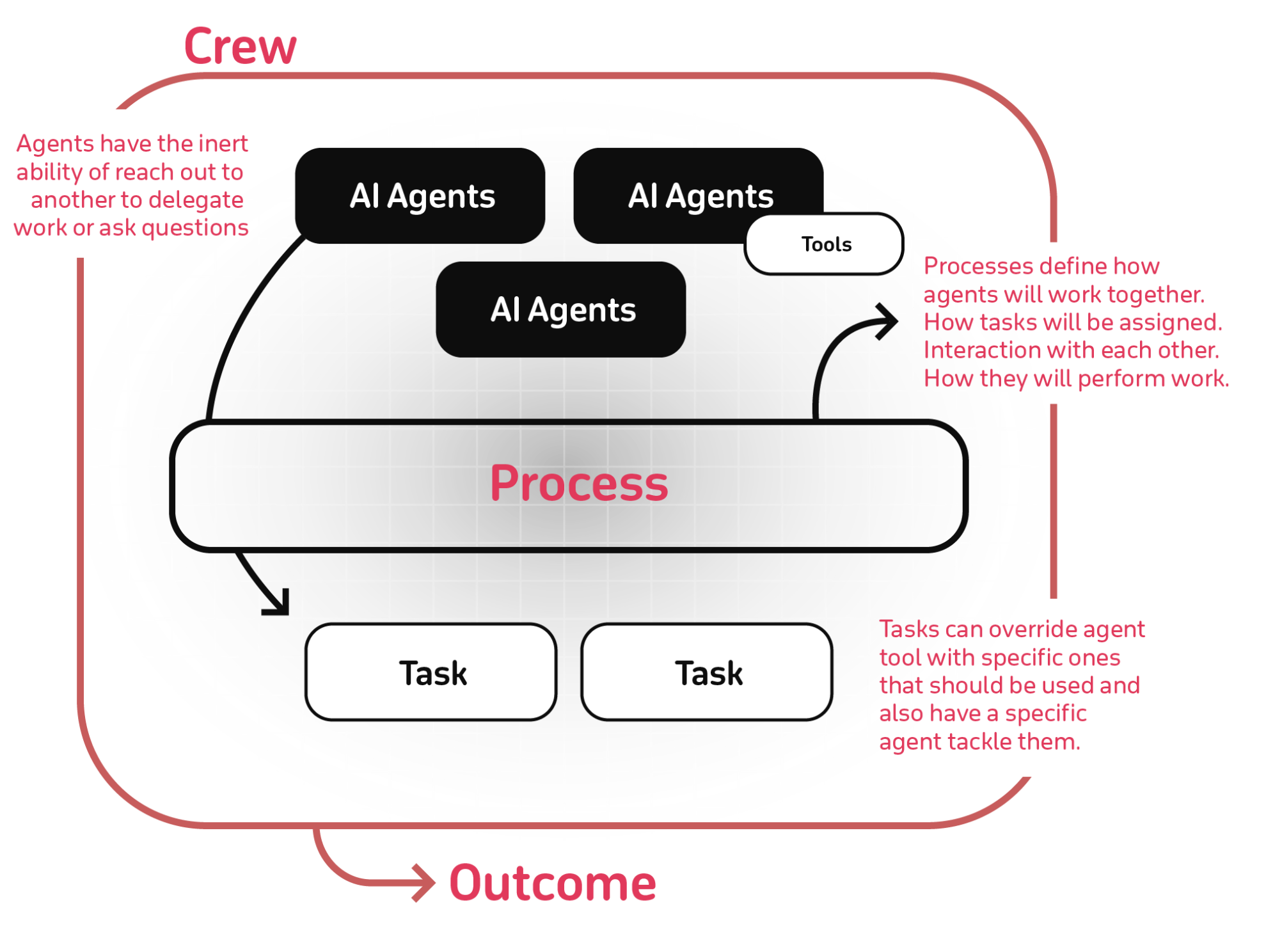 Process: 프로세스는 에이전트들이 태스크를 효율적으로 수행할 수 있도록 작업의 흐름을 조정하는 역할을 합니다.