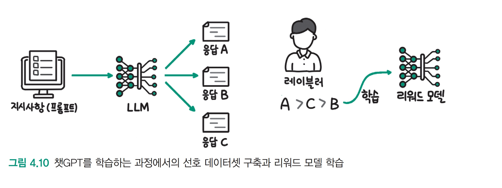 그림 4.10 처럼 labeler 가 A > C > B 로 점수를 평가하고 이를 모델이 다시 학습하도록 한다