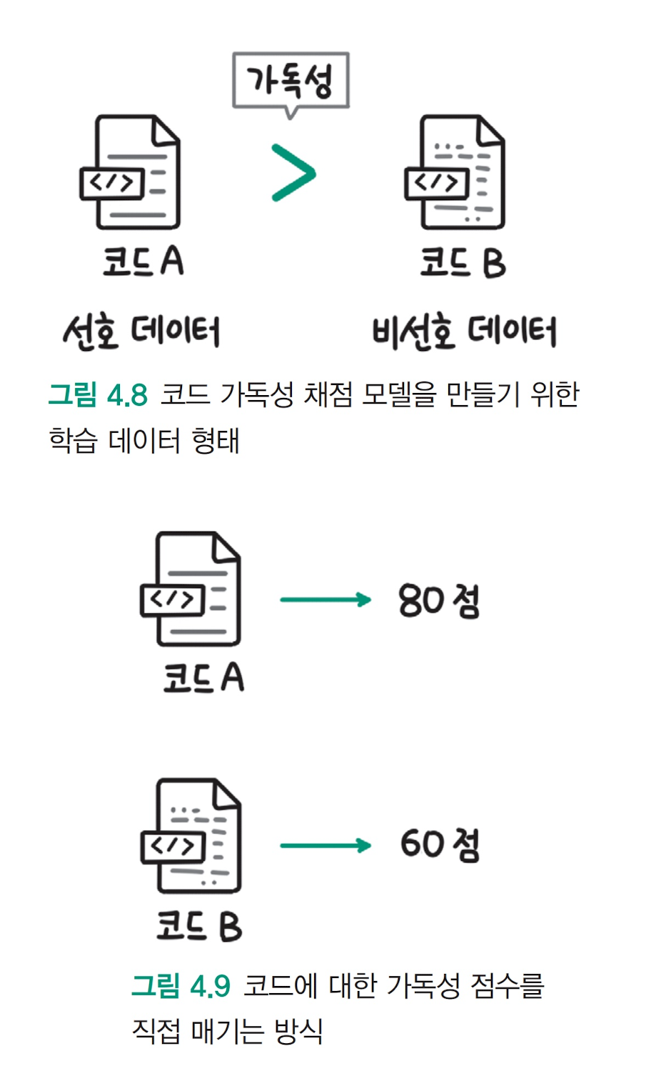 그림 4.8 코드 가독성 채점 모델을 만들기 위한 학습 데이터 형태 선호 데이터 셋 preference dataset 학습방법 :