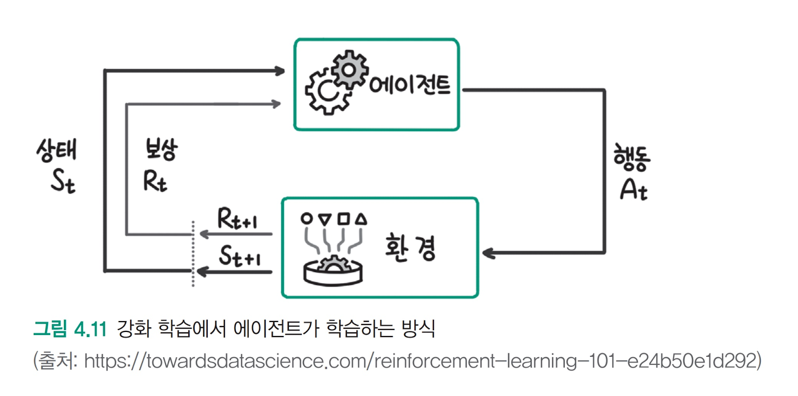 그림 4.11 과 같이 에이전트(Agent)가 환경(Environment)에서 행동(Action)을 한다.