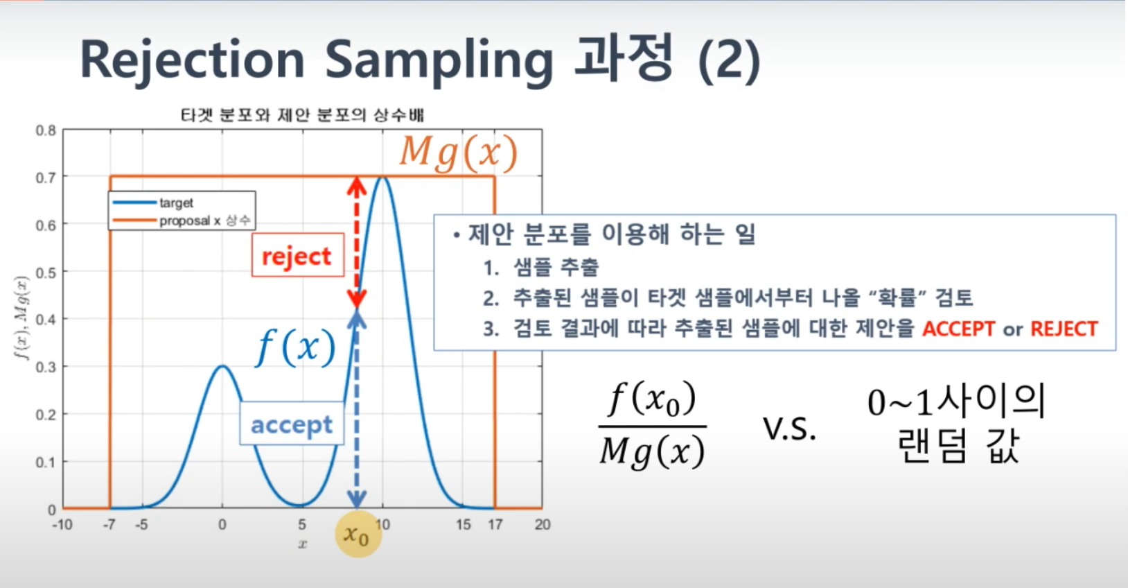 - 기각 기준(Rejection Criterion): 제안 분포에서 생성된 샘플을 목표 분포에 맞게 조정하기 위한 조건입니다. 일반적으로 와 q(x)의 비율을 사용합니다.