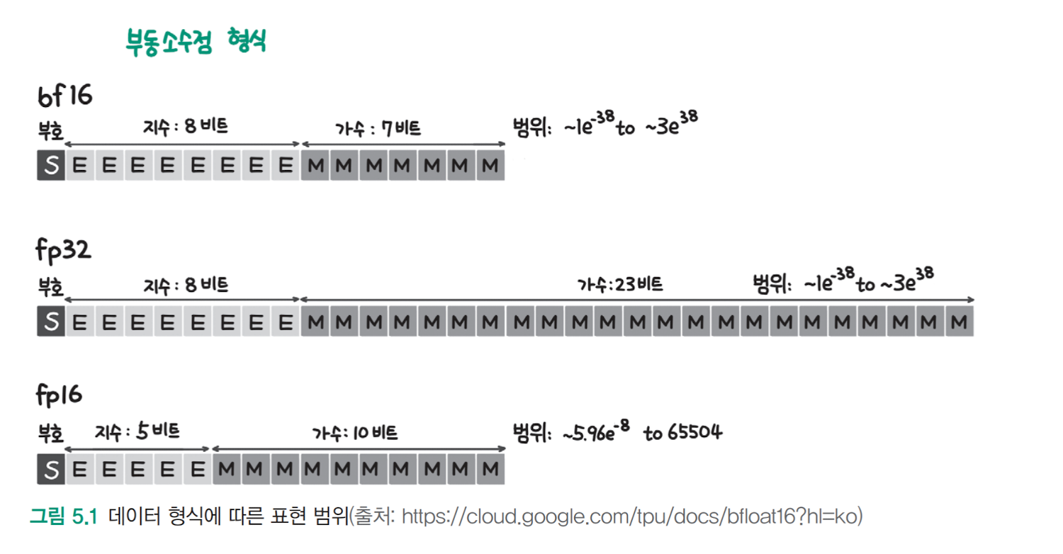 bf16은 지수 8비트, 가수로 7비트만 사용 ( fp16 의 범위를 늘리기 위해 조정, 세밀함은 희생 )