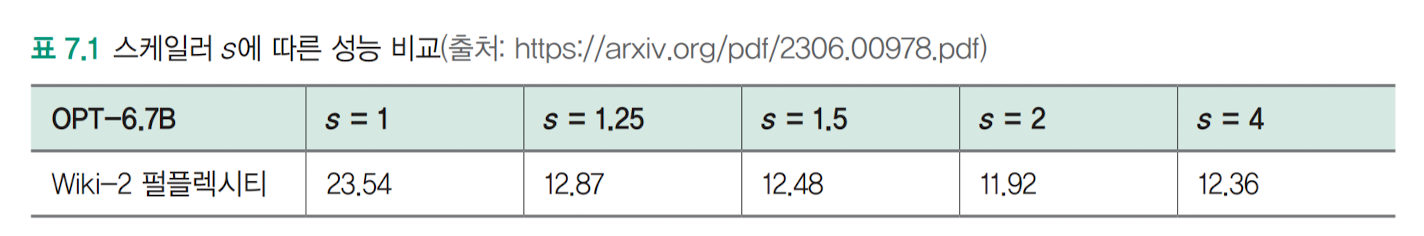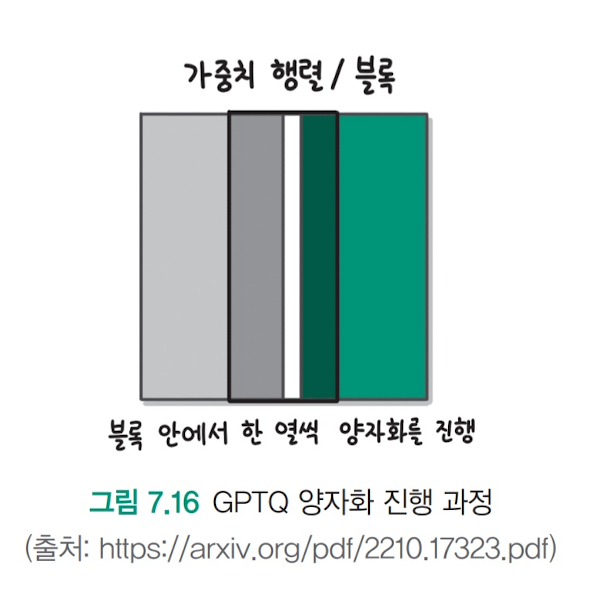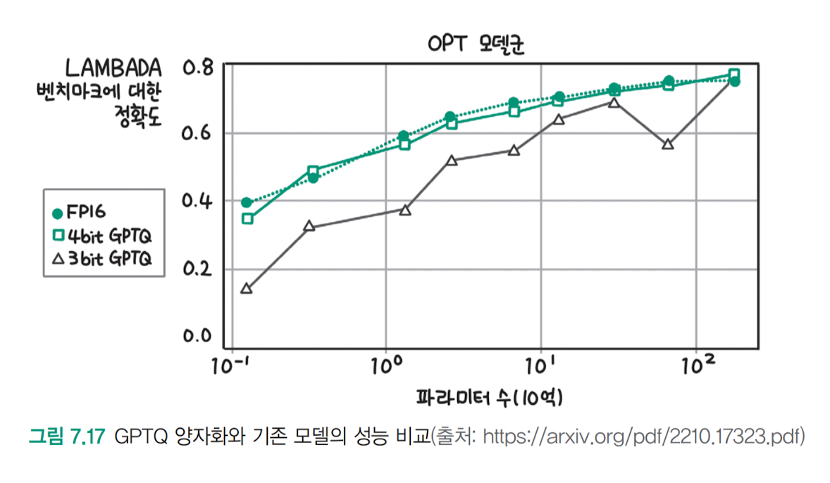 from transformers import AutoModelForCausalLM, BitsAndBytesConfig # 8비트 양자화 모델 불러오기 bnb_config_8bit = BitsAndBytesConfig(load_in_8bit=True) model_8bit = AutoModelForCausalLM.from_pretrained("facebook/opt-350m", quantization_config=bnb_config_8bit) # 4비트 양자화 모델 불러오기 bnb_config_4bit = BitsAndBytesConfig(load_in_4bit=True, bnb_4bit_quant_type="nf4") model_4bit = AutoModelForCausalLM.from_pretrained("facebook/opt-350m", low_cpu_mem_usage=True, quantization_config=bnb_config_4bit)7.2.2 GPTQ