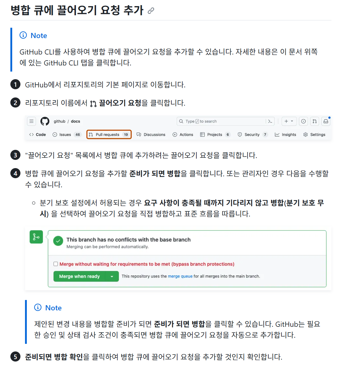 - 사용자는 저장소 수준에서 병합 대기열을 사용하여 병합을 수행하도록 요구할 수 있습니다. GitHub 블로그 게시물을 참조하세요 . 병합 대기열에 대한 자세한 내용은 다음을 참조하세요. 큐와 끌어오기 요청 .