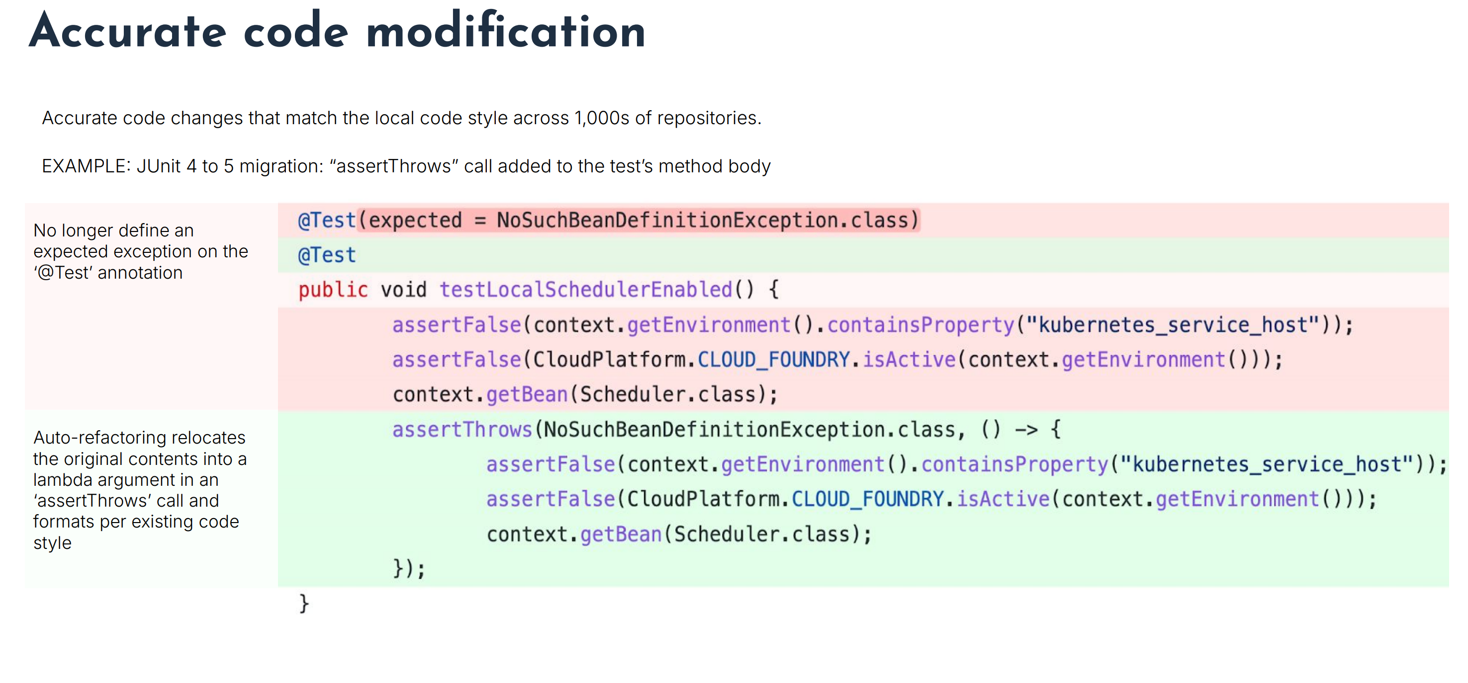 - JUnit 4의 @Test(expected=...)를 JUnit 5의 **assertThrows(() -> {})**로 코드 스타일을 유지하며 정확하게 변환.
