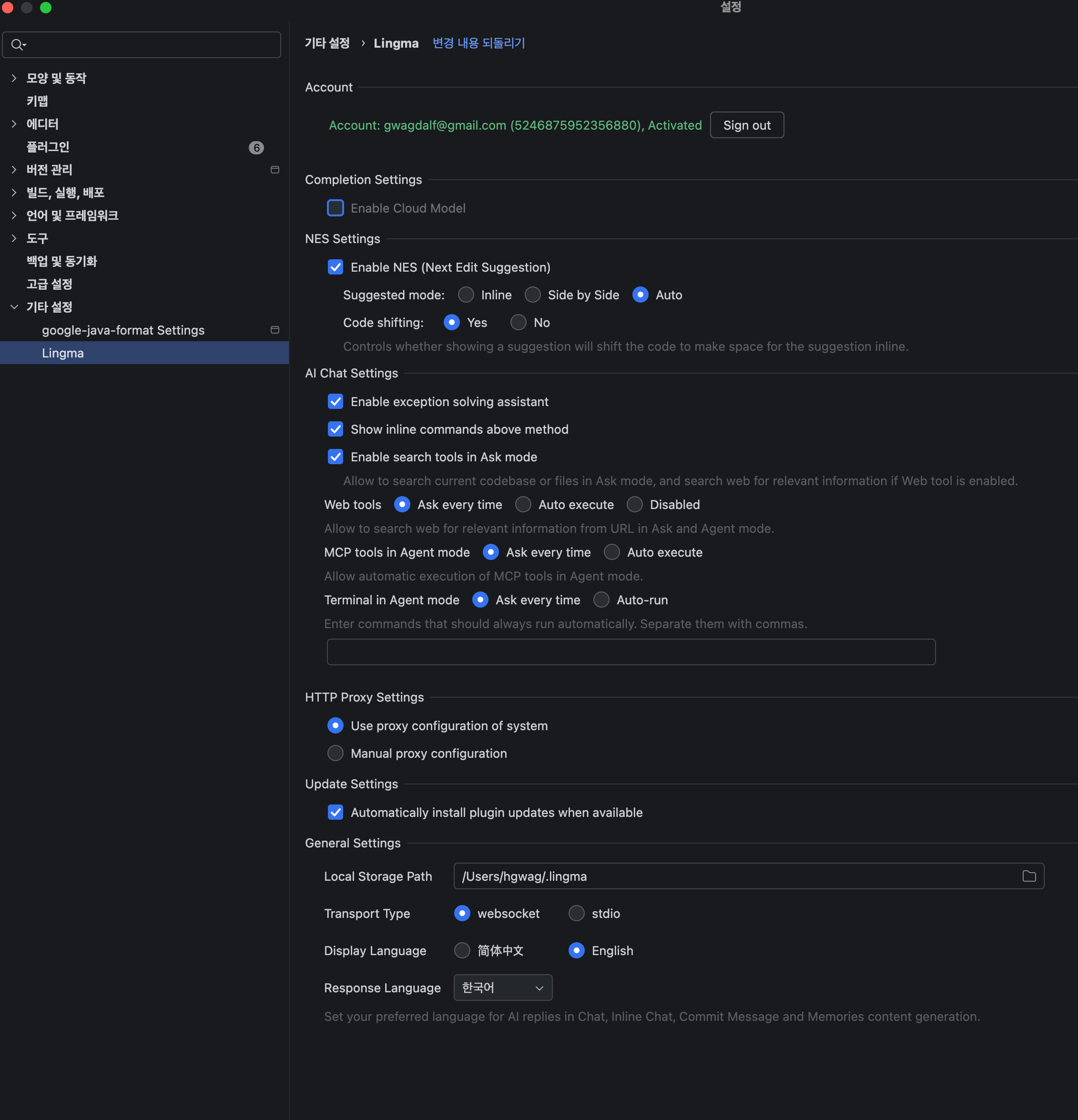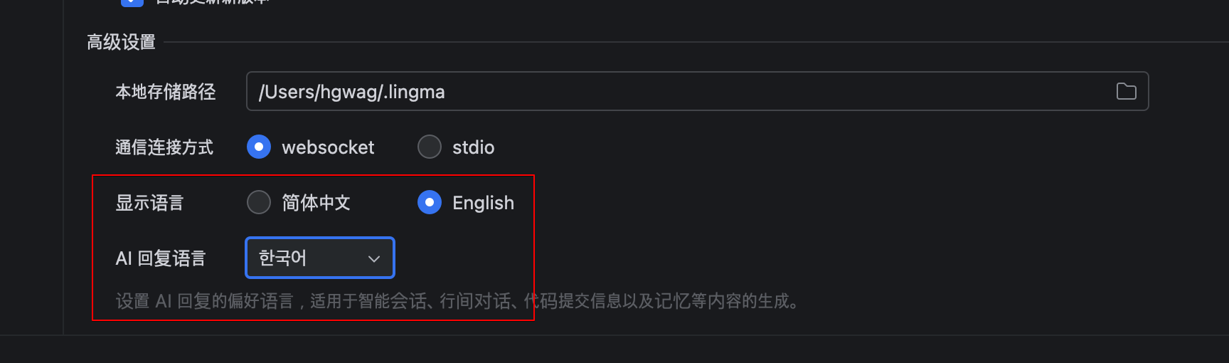 설정 > 기타설정 > Lingma 에서 언어 변경