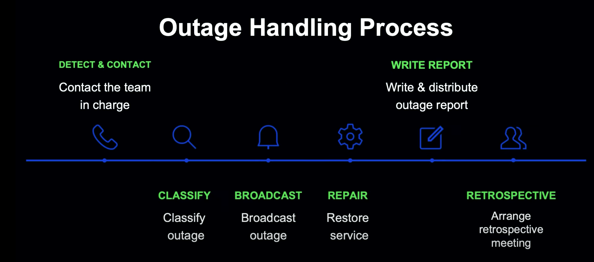 -> 우리의 장애대응 프로세스와 매우 유사하다. 그리고 우리가 보강해야 할 단계는 회고(Retrospective)와 개선 계획을 포함한 post-mortem 이다.