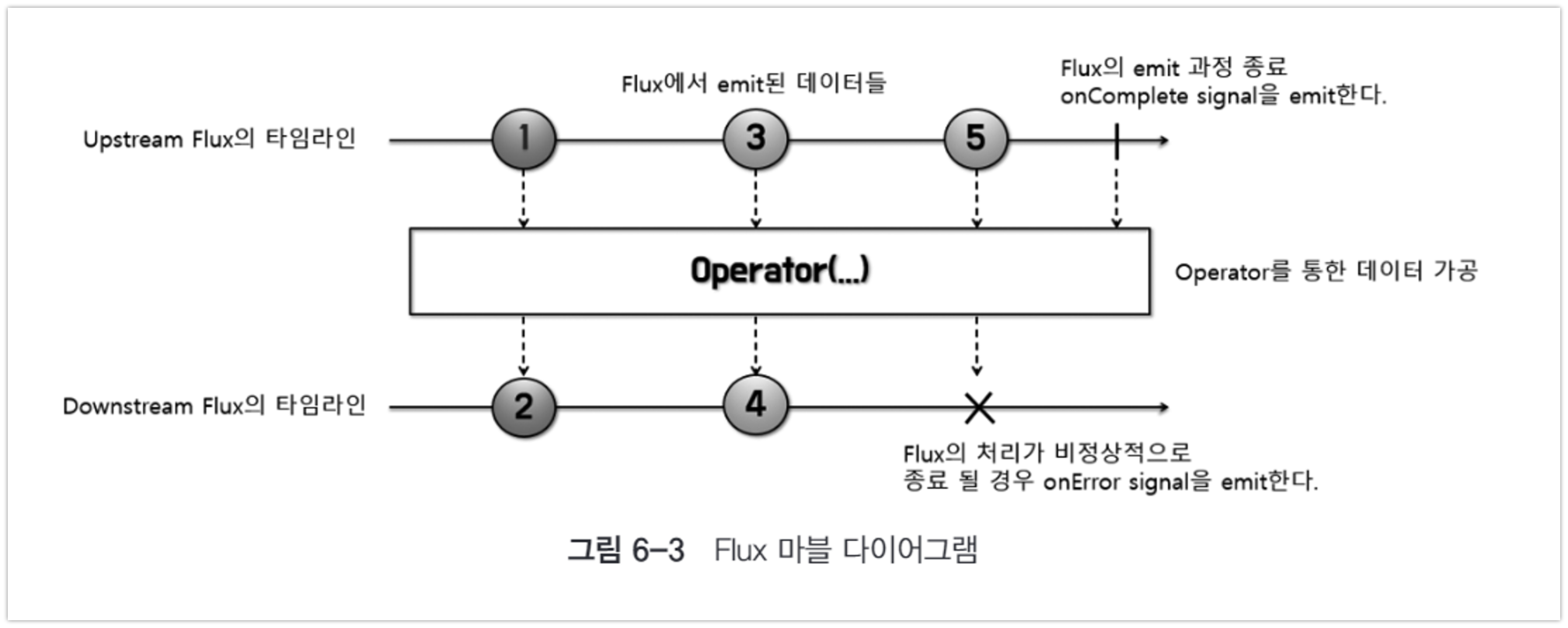 public static void main(String[] args) { URI worldTimeUri = UriComponentsBuilder.newInstance().scheme("http") .host("worldtimeapi.org") .port(80) .path("/api/timezone/Asia/Seoul") .build() .encode() .toUri(); RestTemplate restTemplate = new RestTemplate(); HttpHeaders headers = new HttpHeaders(); headers.setAccept(Collections.singletonList(MediaType.APPLICATION_JSON)); Mono.just( restTemplate .exchange(worldTimeUri, HttpMethod.GET, new HttpEntity<String>(headers), String.class) ) .map(response -> { DocumentContext jsonContext = JsonPath.parse(response.getBody()); String dateTime = jsonContext.read("$.datetime"); return dateTime; }) .subscribe( data -> System.out.println("# emitted data: " + data), error -> { System.out.println(error); }, () -> System.out.println("# emitted onComplete signal") ); } // 실행결과 14:03:26.654 [main] DEBUG- HTTP GET http://worldtimeapi.org:80/api/timezone/Asia/Seoul 14:03:26.666 [main] DEBUG- Accept=[text/plain, application/json, application/*+json, */*] 14:03:27.141 [main] DEBUG- Response 200 OK 14:03:27.143 [main] DEBUG- Reading to [java.lang.String] as "application/json;charset=utf-8" 14:03:27.228 [main] DEBUG- Evaluating path: $['datetime'] # emitted data: 2023-04-23T14:03:27.048628+09:00 # emitted onComplete signalFlux