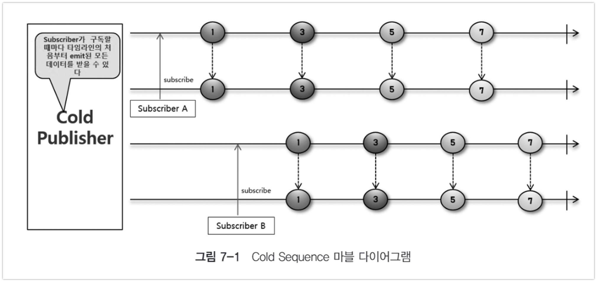 Subscriber A 와 Subscriber B의 구독시점이 다름니다.