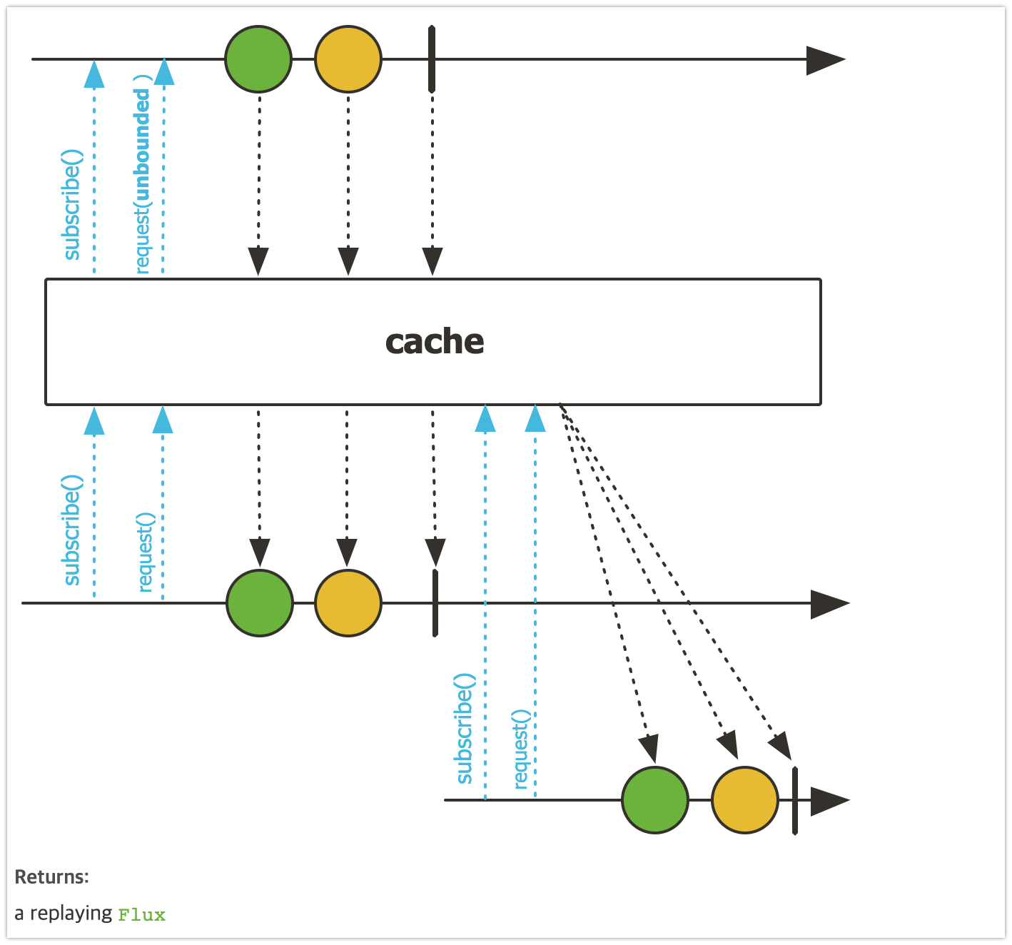 public static void main(String[] args) throws InterruptedException { URI worldTimeUri = UriComponentsBuilder.newInstance().scheme("http") .host("worldtimeapi.org") .port(80) .path("/api/timezone/Asia/Seoul") .build() .encode() .toUri(); Mono<String> mono = getWorldTime(worldTimeUri).cache(); mono.subscribe(dateTime -> log.info("# dateTime 1: {}", dateTime)); Thread.sleep(2000); mono.subscribe(dateTime -> log.info("# dateTime 2: {}", dateTime)); Thread.sleep(2000); } private static Mono<String> getWorldTime(URI worldTimeUri) { return WebClient.create() .get() .uri(worldTimeUri) .retrieve() .bodyToMono(String.class) .map(response -> { DocumentContext jsonContext = JsonPath.parse(response); String dateTime = jsonContext.read("$.datetime"); return dateTime; }); } // 결과 18:21:36.928 [reactor-http-nio-2] INFO - # dateTime 1: 2023-04-23T18:21:36.699458+09:00 18:21:38.345 [main] INFO - # dateTime 2: 2023-04-23T18:21:36.699458+09:00cache
