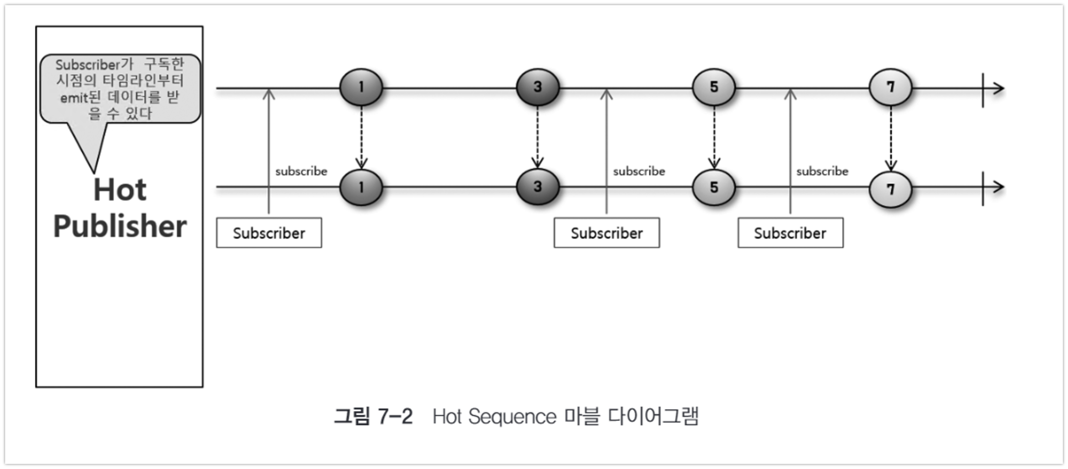 Hot Sequece의 경우 Subscriber가 구독이 발생한 시점 이후에 emit 된 데이터만 전달받을 수 있다.