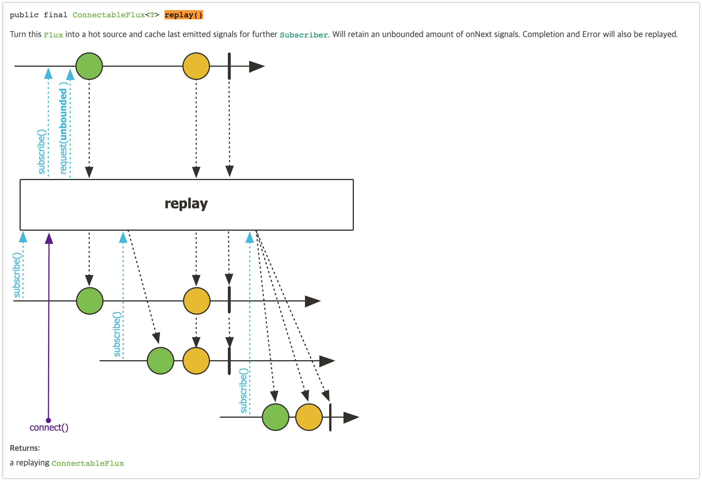 public final ConnectableFlux<T> replay()Will retain an unbounded amount of onNext signals. Completion and Error will also be replayed.