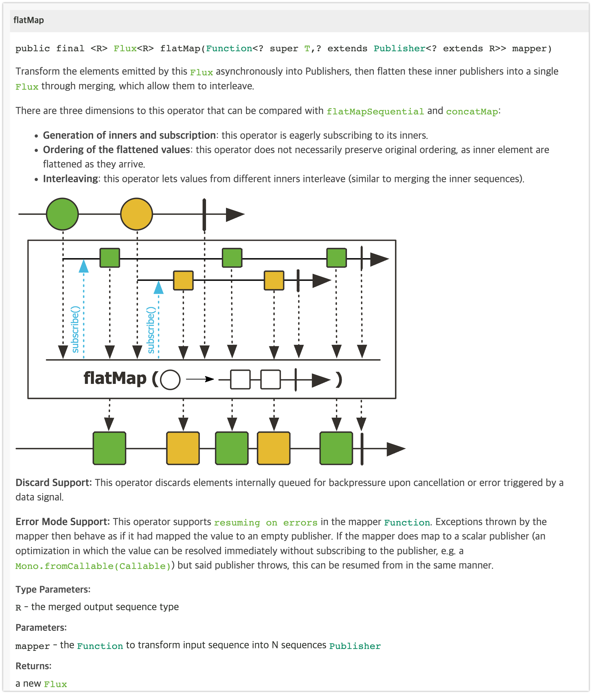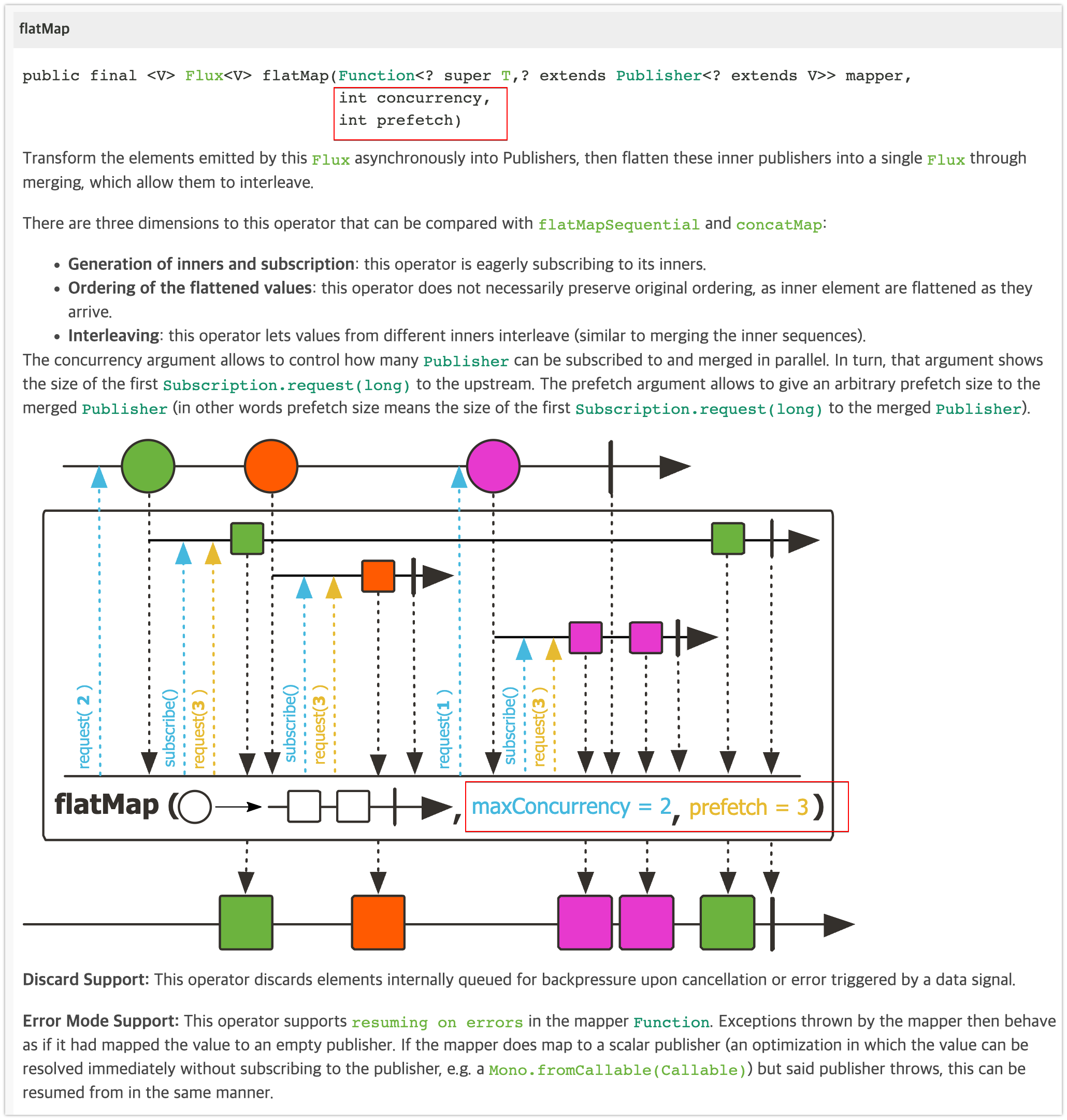 - Ordering of the flattened values: this operator does not necessarily preserve original ordering, as inner element are flattened as they arrive.
