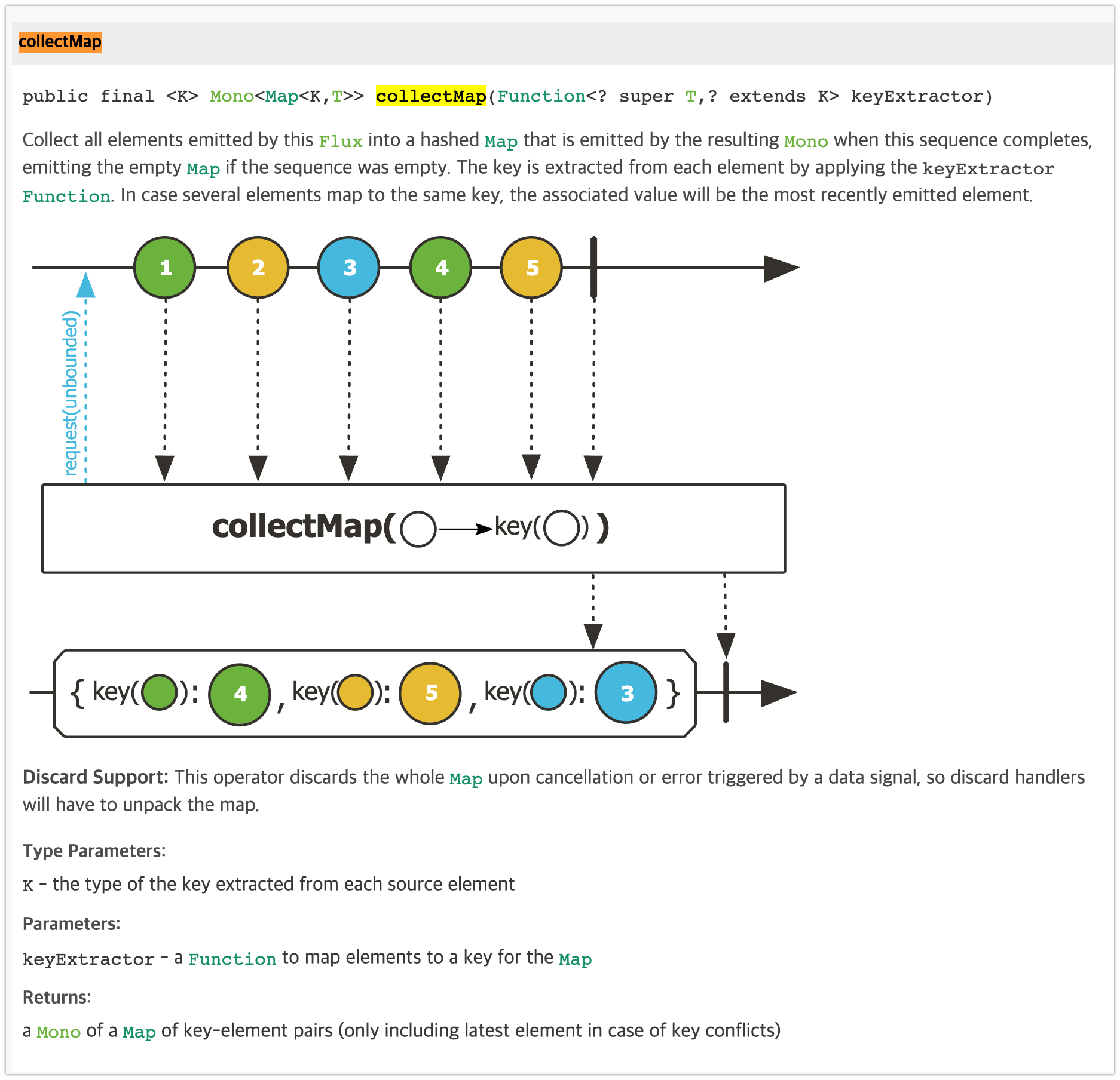 collectMap() Operator 는 Flux 에서 emit 된 데이터를 기반으로 key 와 value 를 생성하여 Map 의 Element 로 추가한 후,