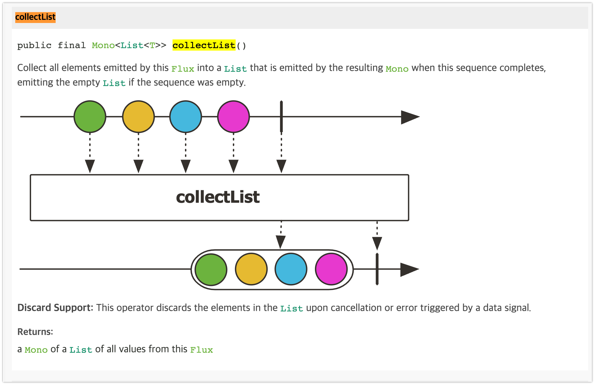 collectList() Operator 는 Flux 에서 emit 된 데이터를 모아서 List 로 변환한 후,