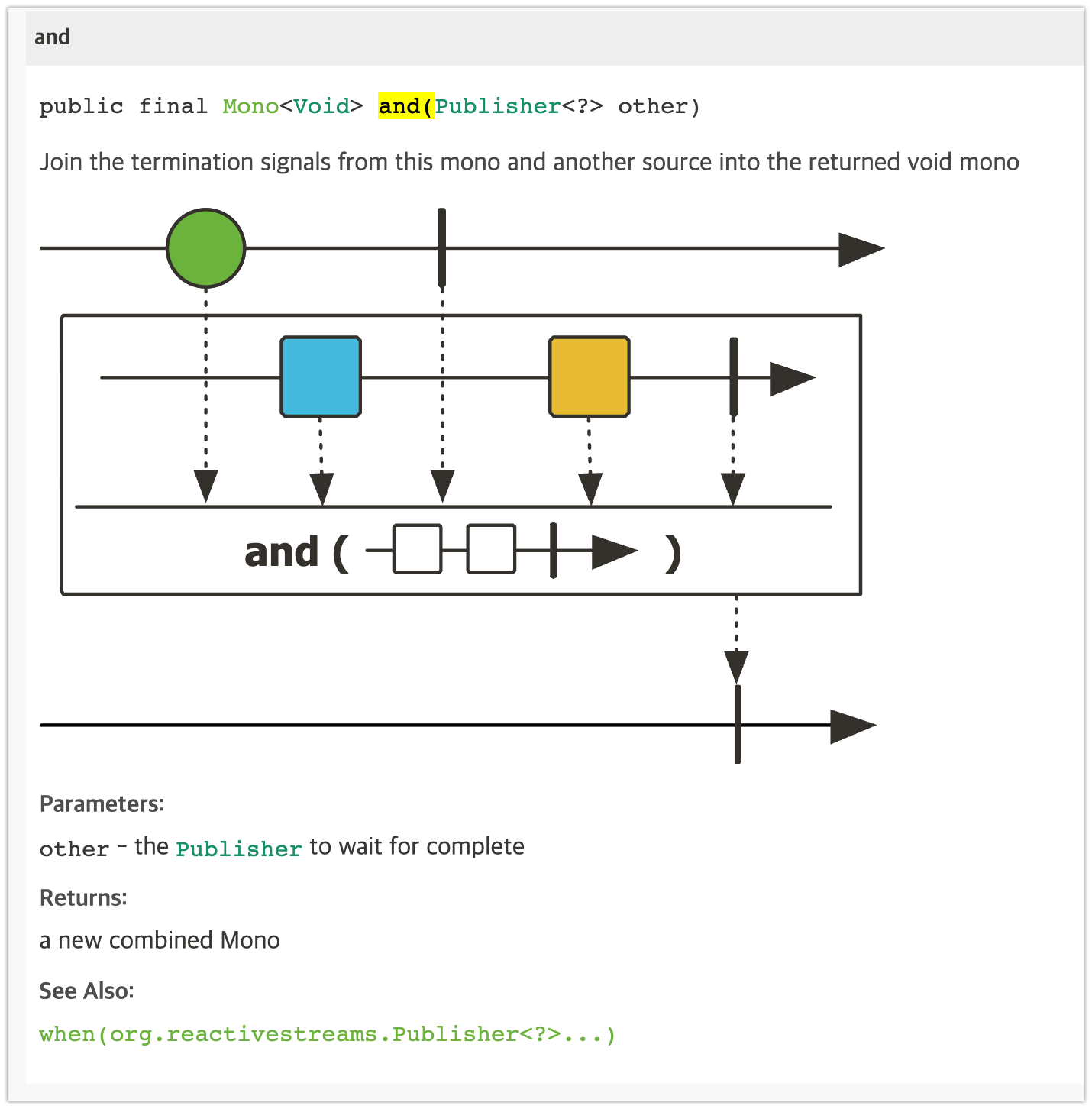 and() Operator 는 Mono 의 Complete Signal 과 파라미터로 입력된 Publisher 의 Complete Signal 을 결합하여 새로운 Mono<Void>를 반환합니다