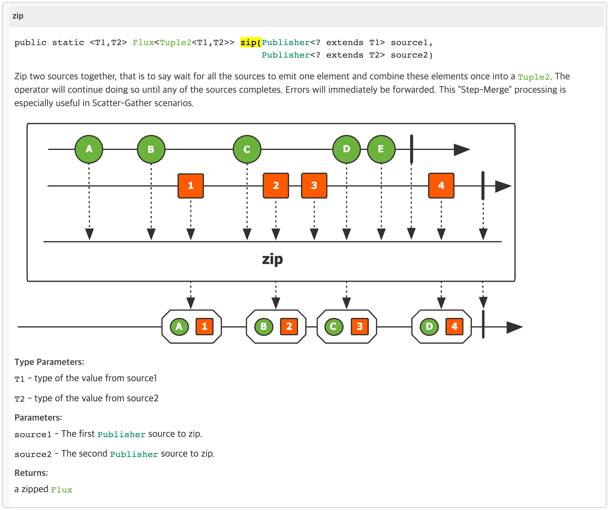 zip() Operator s s 파라미터로 입력되는 Publisher Sequence 에서 emit 된 데이터를 결합하는데,