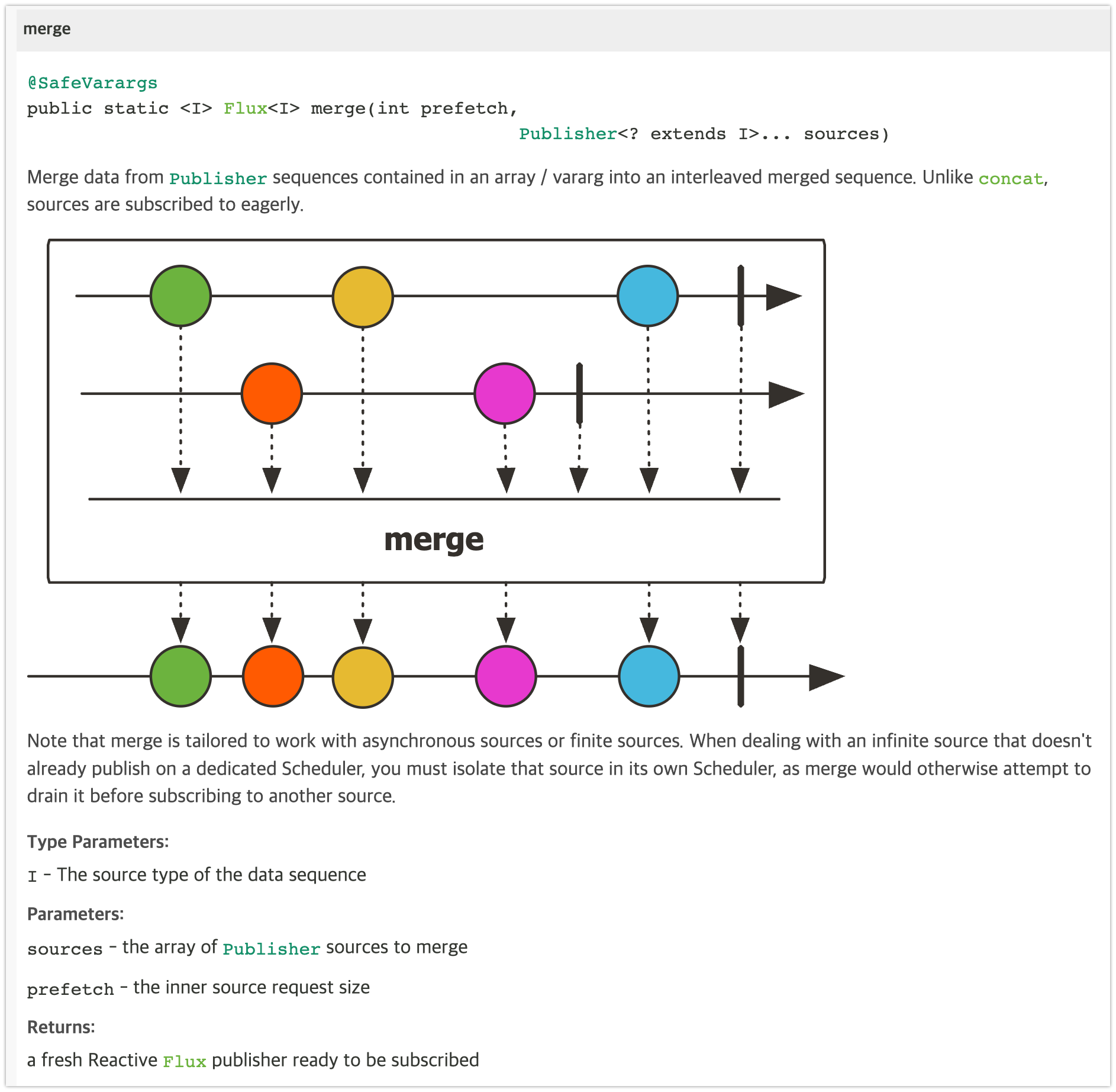 merge() 는 concat() 처럼 먼저 입력된 Publisher 의 Sequence 가 종료될 때까지 나머지 Publisher 의 Sequence 가 Subscribe 되지 않고 대기하는 것이 아니라 모든 Publisher 의 Sequence 가 즉시 subscribe 됩니다