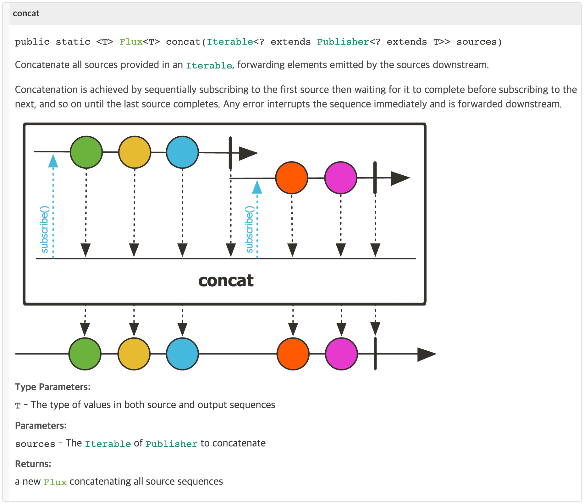 concat() Operator 는 파라미터로 입력되는 Publisher 의 Sequence 를 연결해서 데이터를 순차적으로 emit 합니다