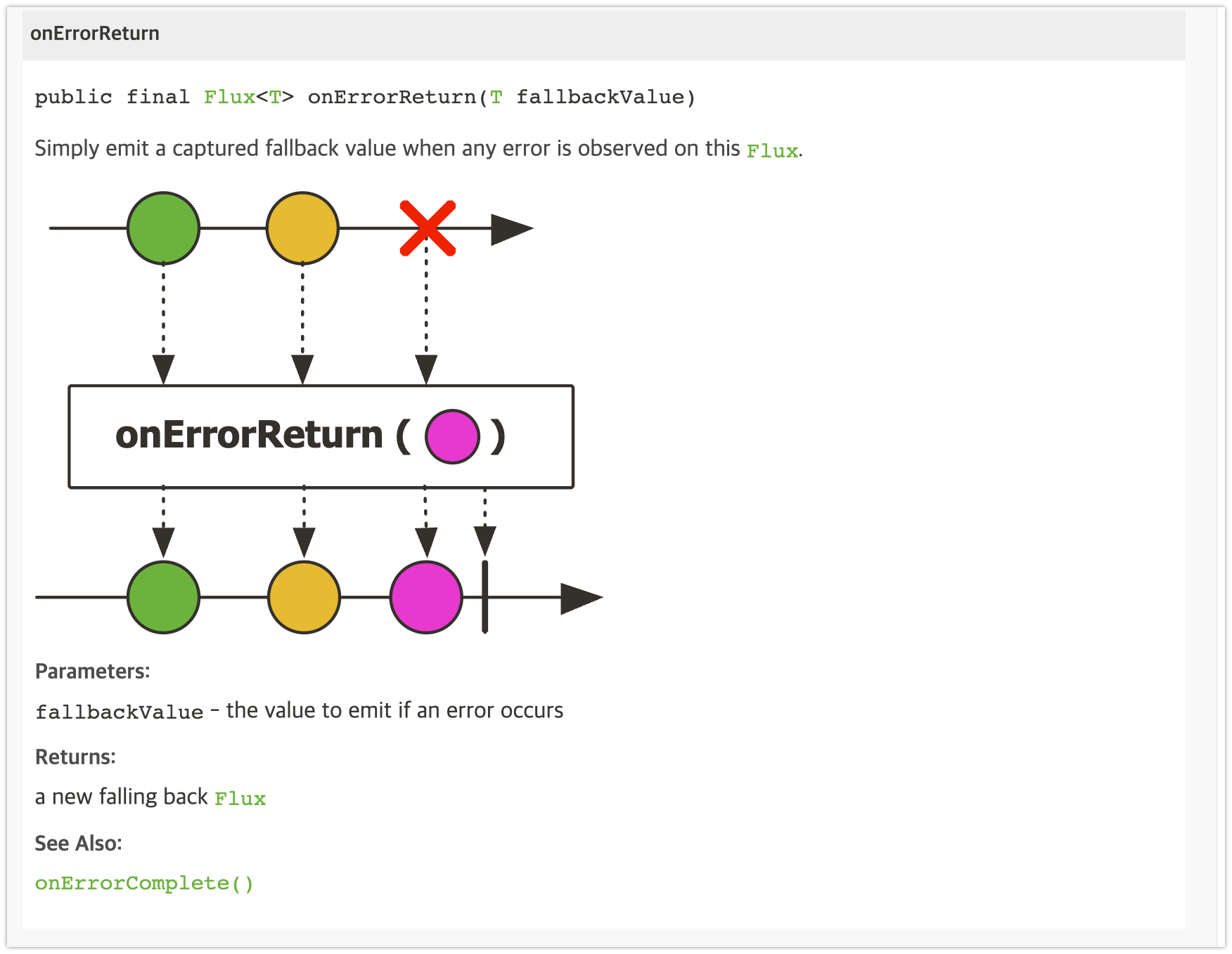 onErrorContinue() 의 파라미터인 BiConsumer 함수형 인터페이스를 통해 에러 메시지와 에러가 발생했을 때 emit 된 데이터를 전달받아서 로그를 기록하는 등의 후처리를 할 수 있습니다.