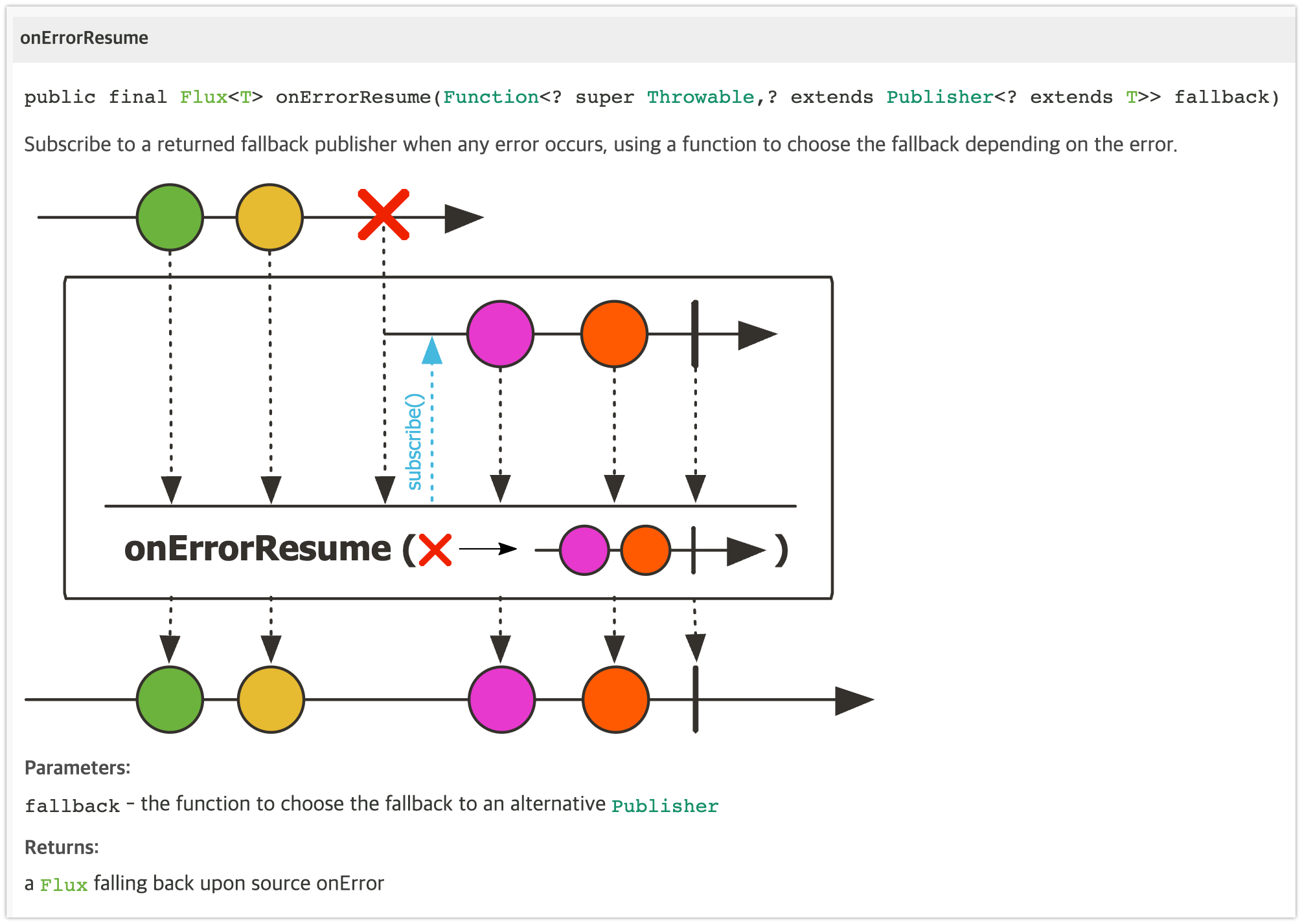 대부분의 에러는 Operator 내부에서 doOnError() Operator 를 통해 로그를 기록하고 onErrorResume() Operator 등으로 처리할 수 있다고 명시합니다.5) retry