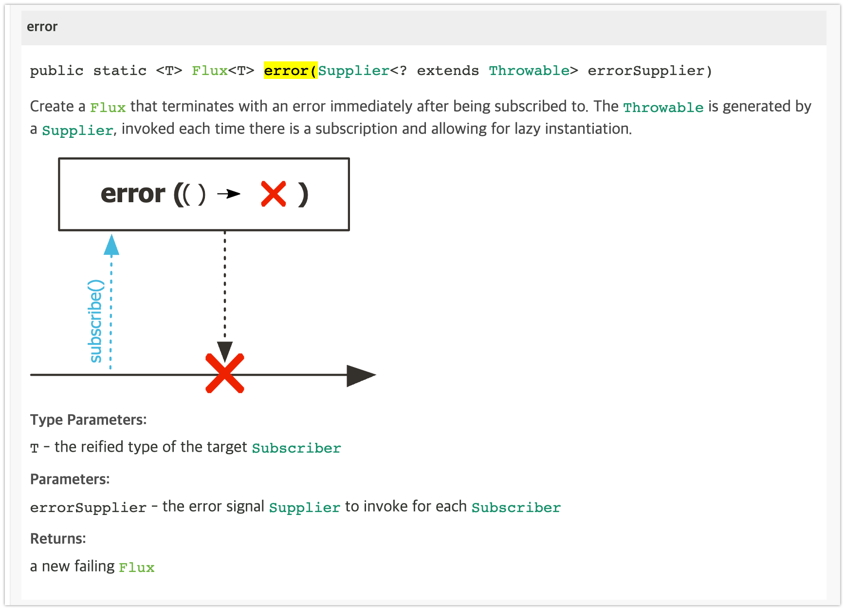 error() Operator 는 파라미터로 지정된 에러로 종료하는 Flux 를 생성합니다
