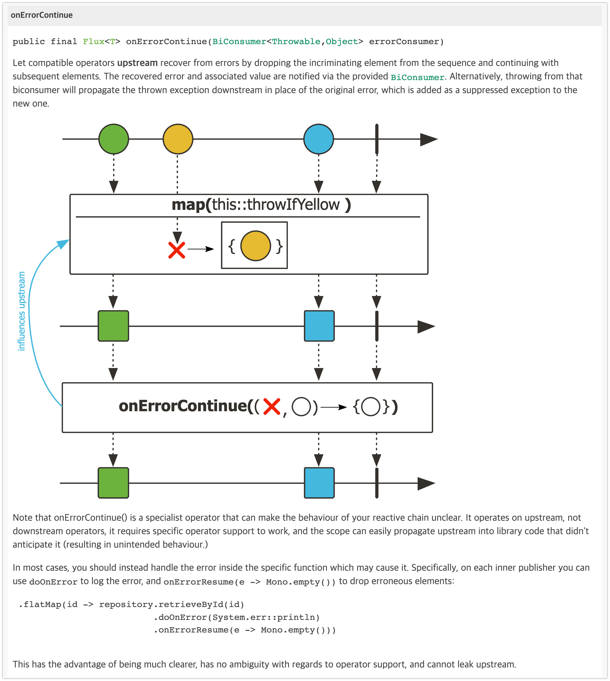 Reactor 공식 문서에서는 onErrorContinue() Operator 가 명확하지 않은 Sequence 의 동작으로 개발자가 의도하지 않은 상황을 발생시킬 수 있기 때문에 onErrorContinue() Operator 를 신중하게 사용하기를 권고합니다.